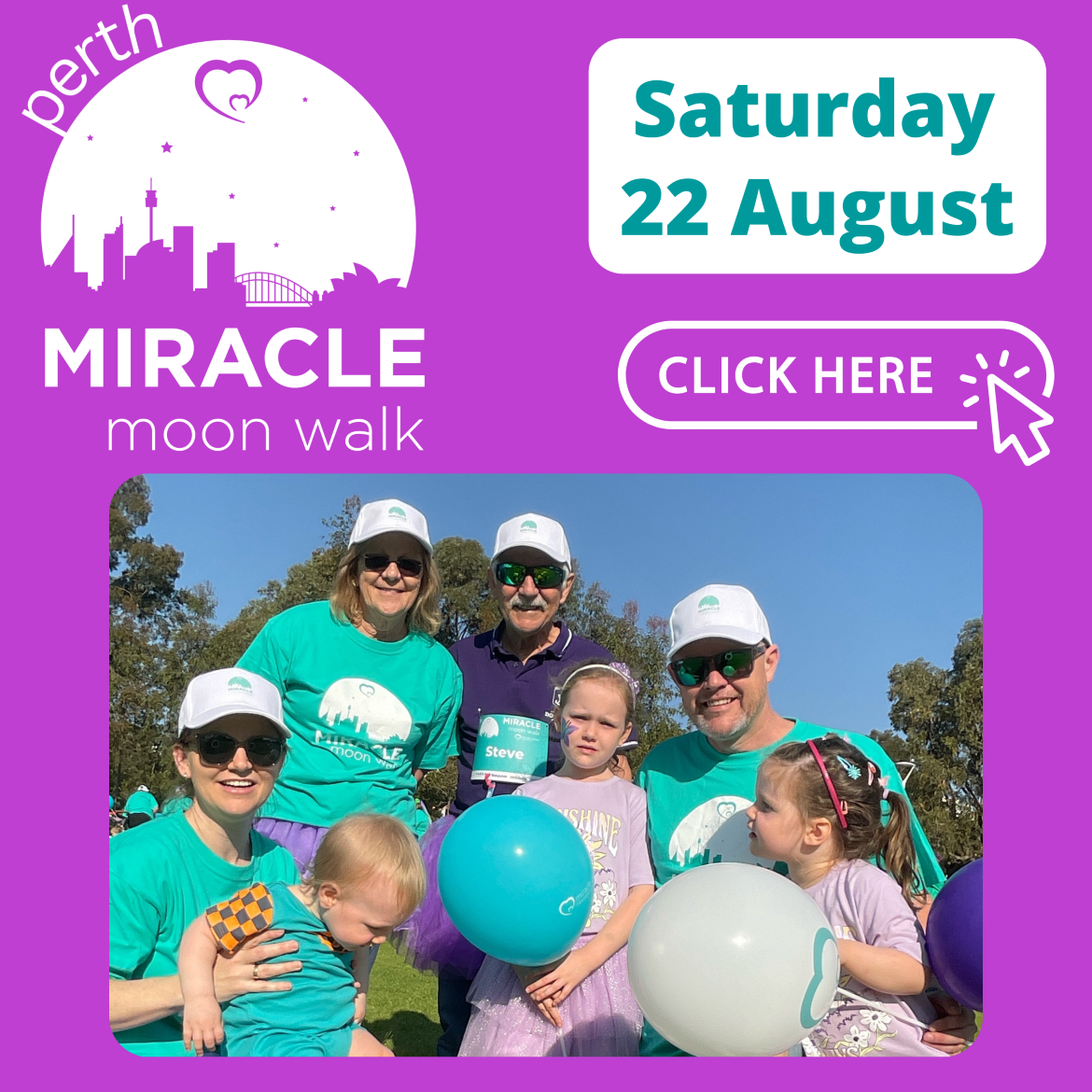 For Sydney and Perth walkers, come dressed in teal or purple to join in on the fun! We will have Miracle Moon Walk shirts available to purchase at the event hubs if you wish, or if you have one from a previous year you are more than welcome to come dressed in that!