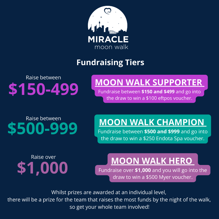 Rego includes entry, event bib, map, Miracle Moon Walk bandana, Miracle Moon Walk drawstring backpack, completion medal, glow sticks, entertainment and other goodies along the way!